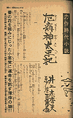 ![]() ![]() | 厄病神太平記「讀切雑誌」第18巻10号(昭和42年10月1日発行)双葉社 雲霧仁左衛門一家の秘密をつかんだ因果小僧六之助。仁左衛門一家と同心のあいだをうまく立ち回り、千両の金を手にしたが....。400字詰め原稿用紙で約80枚の中編。ところで昭和42年には、既に井上名義はやめているはず。再録作品だろうとおもう。 |